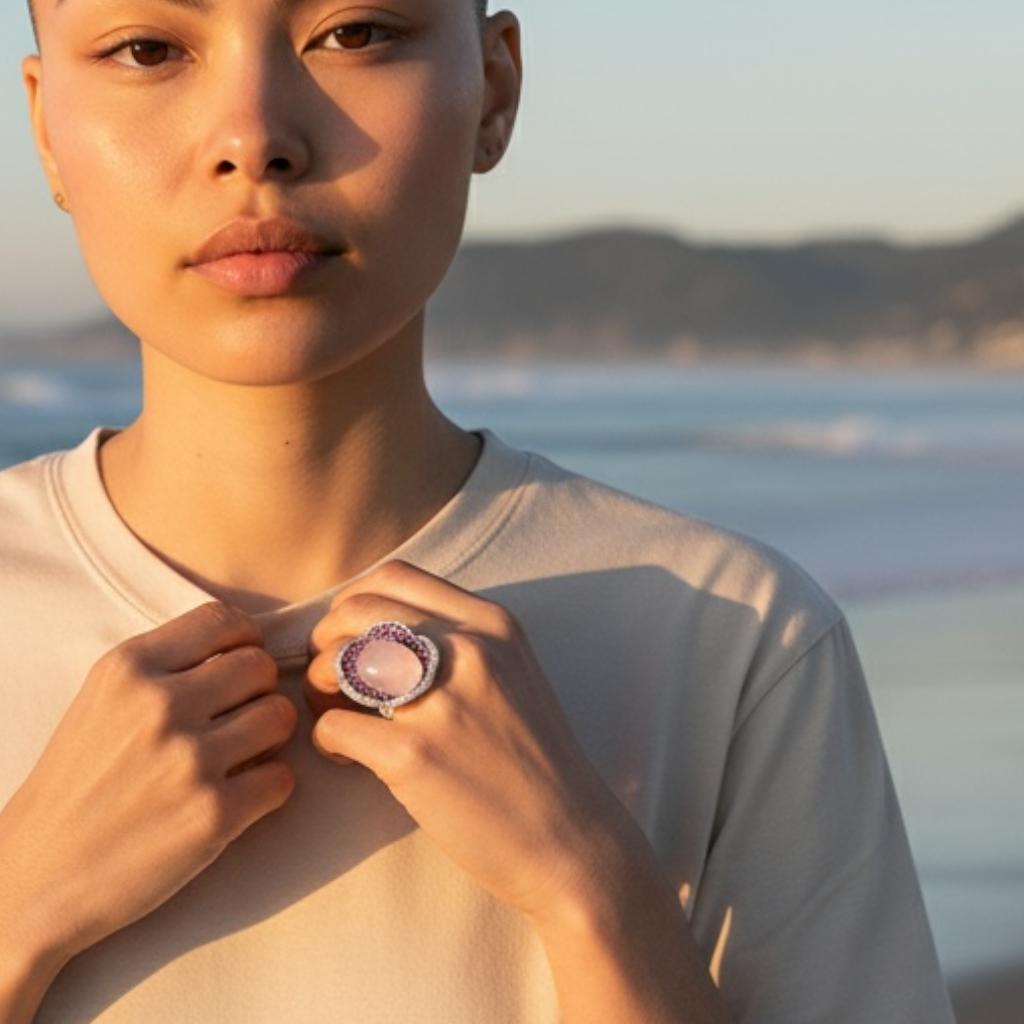 Anello in oro kt18 con diamanti taglio brillante ct 2,12, quarzo rosa e zaffiri ct3,40